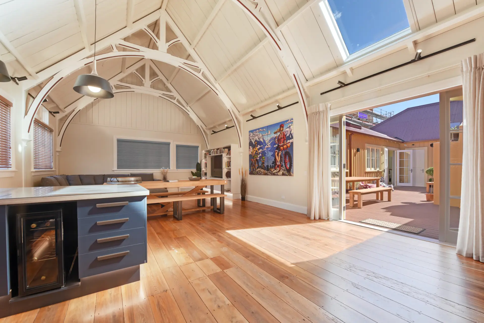 The exposed roof trusses in the kitchen, dining and lounge area have only recently re-emerged after being hidden behind lowered ceilings for more than 100 years!